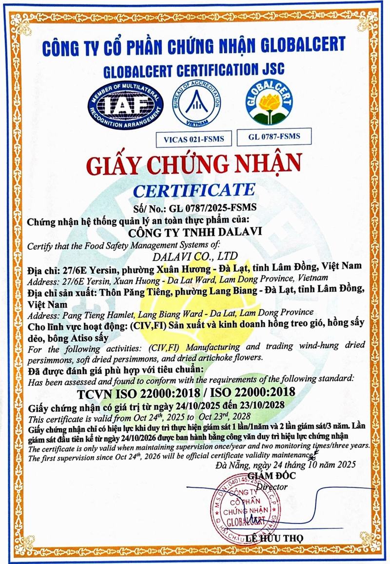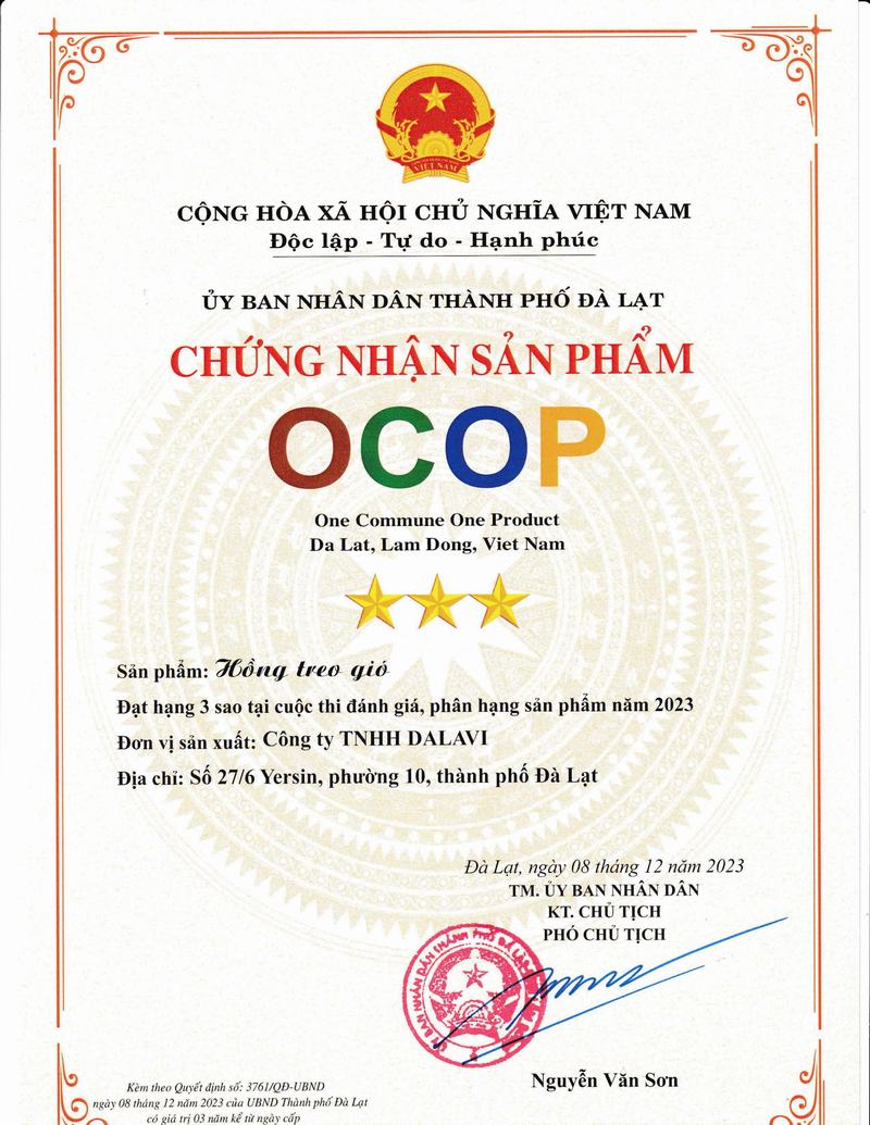 Sản phẩm Hồng treo gió tại DaLaVi vinh dự là một trong những sản phẩm của cửa hàng đạt chứng nhận OCOP (One Commune One Product Of Viet Nam). Đây là kết quả rất đáng tự hào cho sự nổ lực không ngừng trong nhiều năm qua của công ty TNHH DaLaVi, từ đó trở thành động lực thúc đẩy tạo ra nhiều sản phầm chất lượng và giá trị hơn, giúp nâng tầm nông sản Việt.